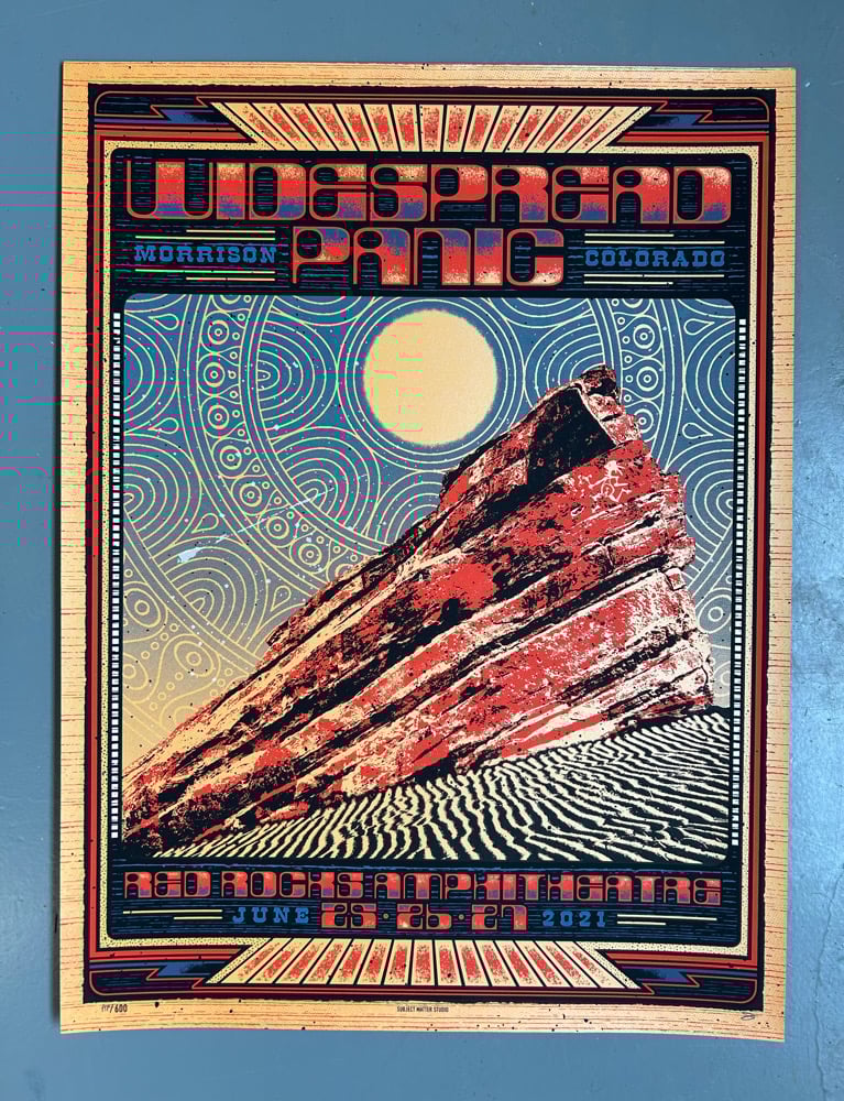 Official poster for Wisespreas Panic’s shows at Red Rocks June 25-27, 2021. 18x24